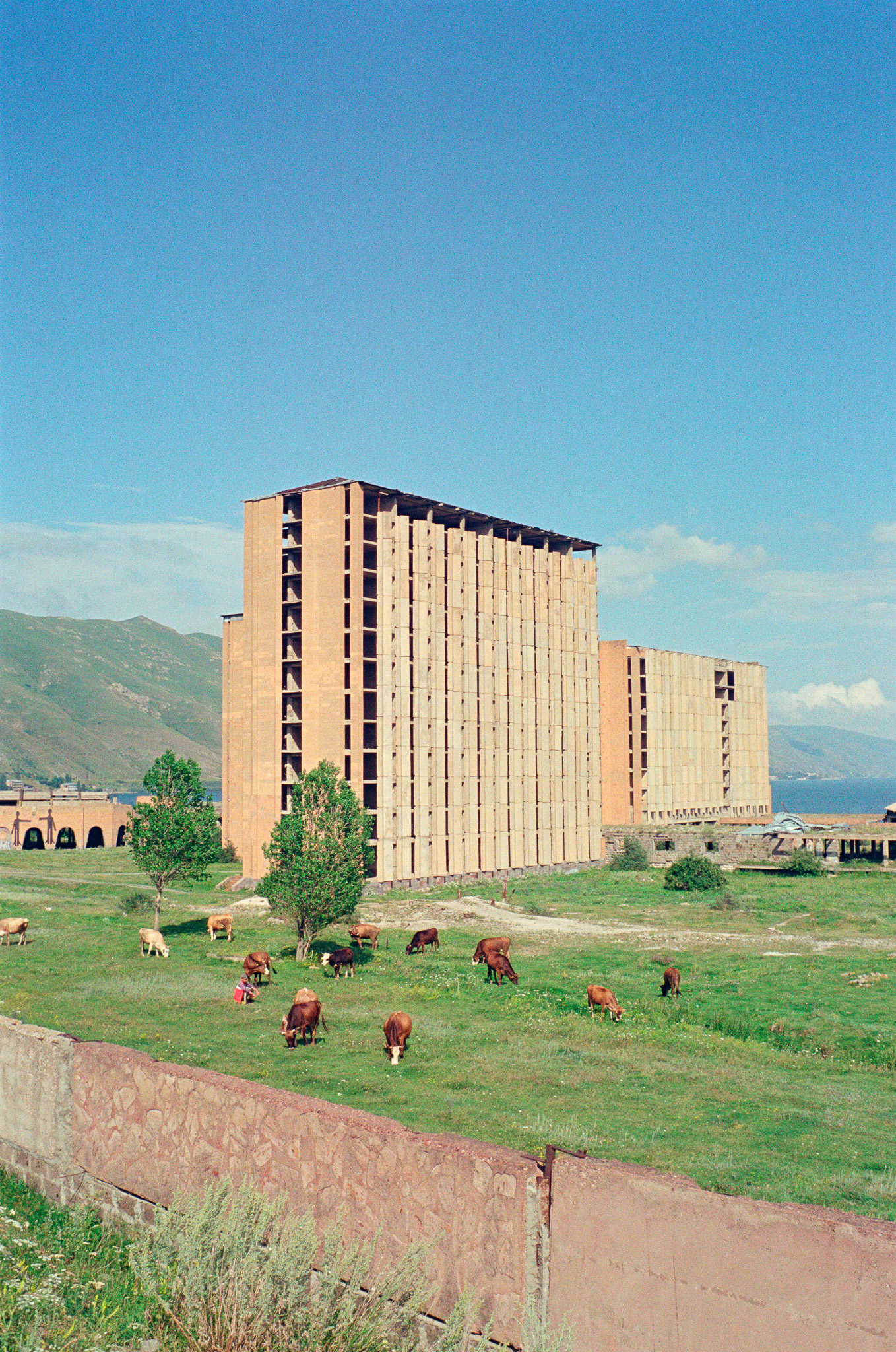 ≪ Prise au bord du lac Sevan en Arménie ce vacher aux couleurs vives garde ses vaches. Au loin, le lac scintille et entre les deux ruines, vestiges de l'URSS. Proportions étranges entre gigantisme et sensation de maquettes.