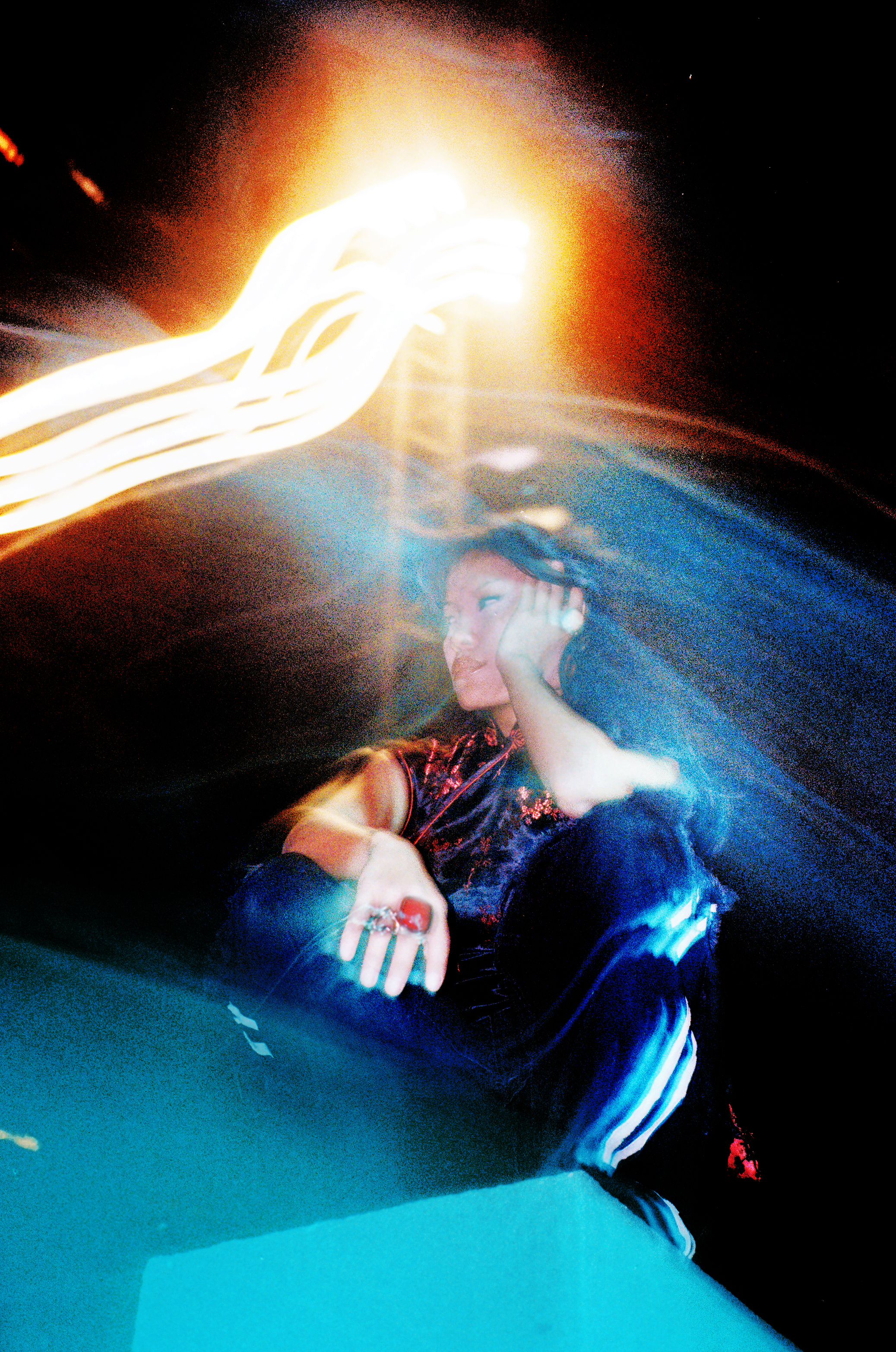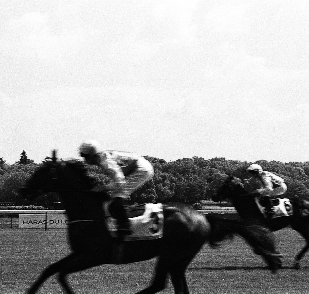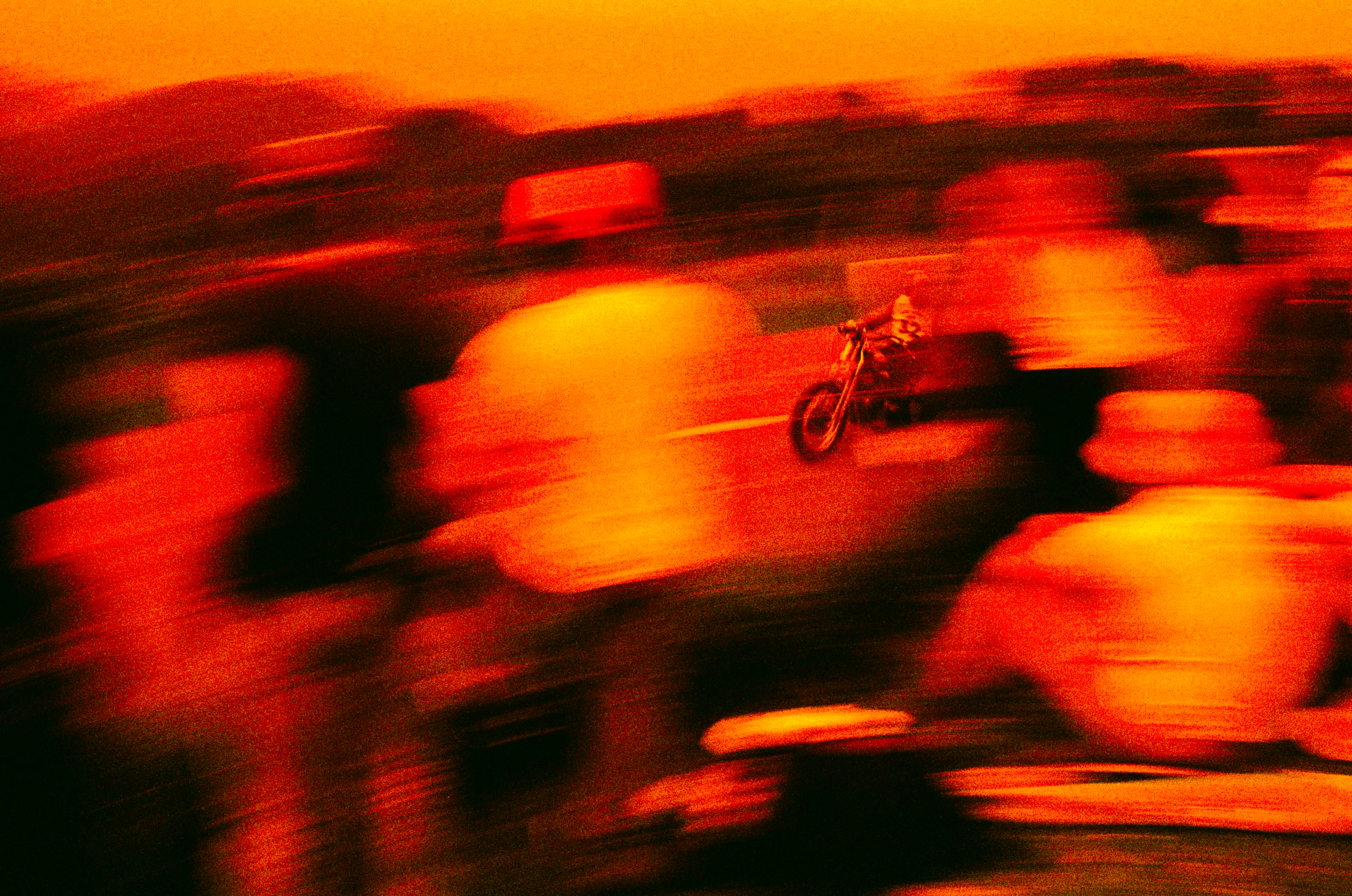 Cette photo a été réalisé lors de la Punk's Peak, une course de côte en duel organisée dans le cadre de Wheels and Waves. Depuis plusieurs années, les organisateurs me font confiance pour capturer à ma manière les différents temps forts du festival. Cette édition, j'ai choisi d'expérimenter la pellicule Redscale, dont le rendu me semblait particulièrement en résonance avec l'univers mécanique et l'esprit des courses de motos customs. J'aime aussi travailler les effets de speedblur, et pour accentuer cette impression de vitesse tout en apportant une dimension plus abstraite, je me suis volontairement placé en retrait du public.