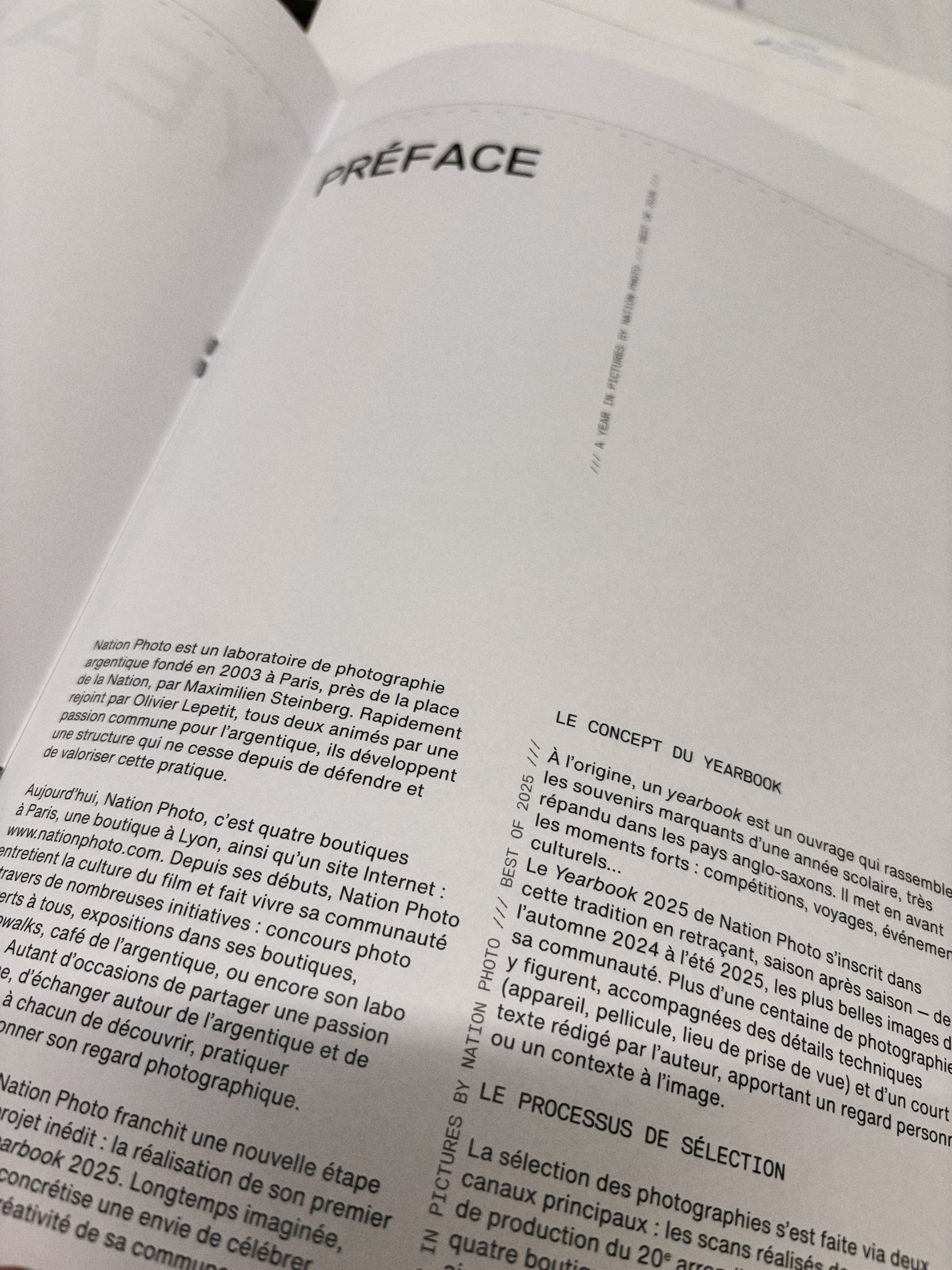 C'est à Bologne, en Italie, sur les presses de L'Artiere, que notre projet a pris vie et s'est transformé en objet que l'on peut toucher : un livre qui rassemble une année entière d'histoires à travers les photographies argentiques de notre communauté. À travers ce livre, ce sont au total 140 photographies capturées par 122 photographes, pour un ouvrage de 176 pages. Lors de précommandes, chaque personne a pu choisir la photo de couverture de son exemplaire parmi les photos sélectionnées pour le YEARBOOK.